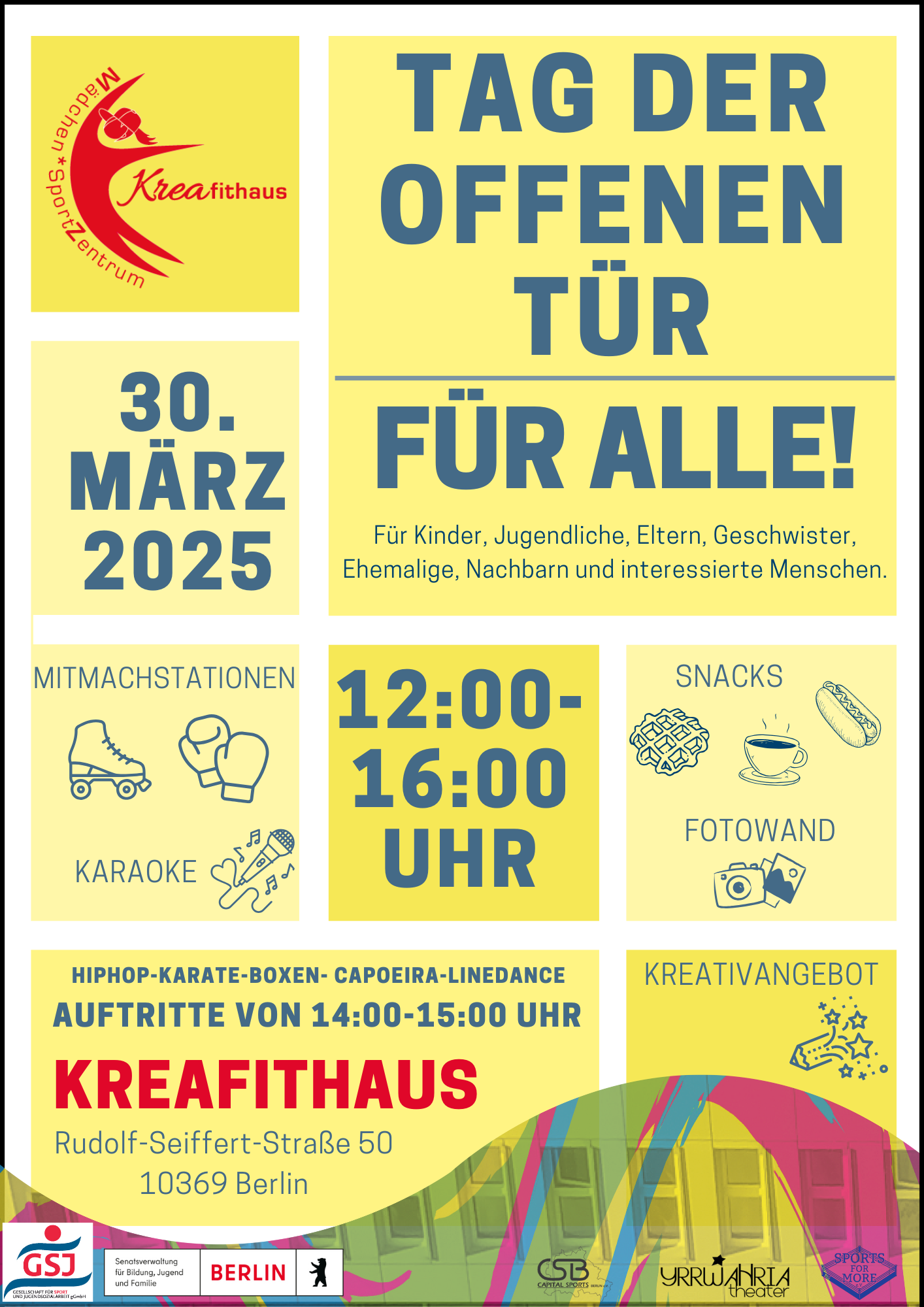 Herzlich eingeladen sind ALLE. Von 12-16 Uhr können die Besucher*innen sich das Haus anschauen und an verschiedenen Aktivitäten teilnehmen. Sehr gern begrüßen wir an diesem Tag auch Eltern und Geschwister, Ehemalige, Nachbar*innen und interessierte Menschen.